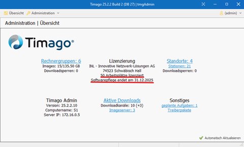 Sie können überprüfen, ob die Installation korrekt durchgeführt wurde, indem Sie die Timago® Administration starten. Wenn die angezeigte Anzahl der Arbeitsplatzlizenzen sowie das Enddatum der Softwarepflege mit Ihrem Einkauf übereinstimmen, war die Installation erfolgreich.