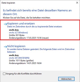 6. Öffnen Sie die angefügte .zip-Datei, kopieren Sie die Datei „snvlic.key“ und fügen Sie sie in den Ordner „BIN“ ein
