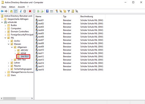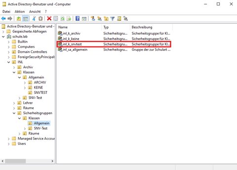 Für jede Klasse wird eine Organisationseinheit in Active Directory erstellt. Diese befindet sich unterhalb der zur Klasse zugeordneten Schulart. In diesem Beispiel sehen Sie die Klasse “SNVTEST”, die der Schulart “Allgemein” untergeordnet ist.
