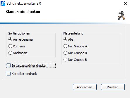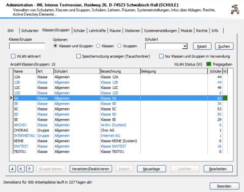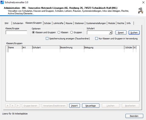 Dieser Programmteil wird für die Verwaltung von Klassen und Gruppen verwendet. Schulnetzverwalter kann eine beliebige Anzahl von Klassen und Gruppen verwalten. Man unterscheidet zwischen: