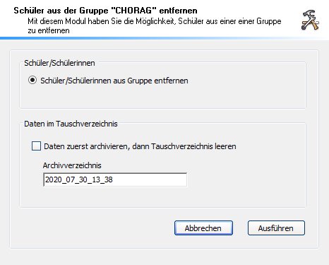 | Gruppe leeren | Alle Schüler aus einer Gruppe entfernen und wahlweise die Daten aus dem Tauschverzeichnis löschen oder archivieren. Siehe Gruppe leeren |