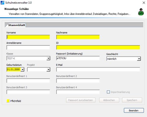 | Anmeldename | Der Anmeldename wird in der Regel vom Schulnetzverwalter automatisch nach den Vorgaben in den Systemeinstellungen gebildet. Füllen Sie dieses Feld mit einem bis zu 20 Zeichen langen Anmeldenamen, wenn Sie keine automatische Namensbildung wünschen |
