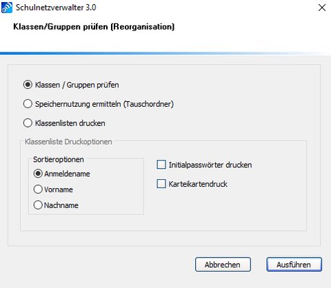 | P (=Prüfen) | Führt einen Prüflauf für die markierten Klassen und Gruppen durch oder ermöglicht es, Klassenlisten zu drucken. Siehe Prüfen / Klassenlisten drucken . Hierüber kann auch die Speichernutzung des Klassen-Tauschlaufwerkes ermittelt werden |
