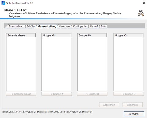 Durch Klassenteilung können die Schüler einer Klasse in bis zu 3 kleinere Gruppen (A, B, C) aufgeteilt werden. Dadurch ist es möglich, jeweils einen Teil einer Klasse in einem separaten Unterrichtsraum auszuwählen und zu unterrichten. Um eine Klassenteilung vorzunehmen oder eine bestehende Klassenteilung zurückzunehmen oder zu ändern, markieren Sie einen oder mehrere Schüler und klicken dann auf eine der Schaltflächen gesamte Klasse”, Gruppe A", Gruppe B" oder Gruppe C". Aus den Gruppen A, B oder C können Schüler mit dem Button Gesamte Klasse" wieder der gesamten Klasse zugeteilt werden. Klicken Sie anschließend auf “Speichern”, um Ihre Eingaben zu speichern oder auf “Abbrechen”, um die Änderungen rückgängig zu machen.