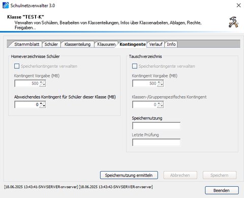 | Speichernutzung ermitteln | Klicke Sie auf diese Schaltfläche, um aktiv die aktuelle Speichernutzung des Homeverzeichnisses der ausgewählten Klasse/ Gruppe zu ermitteln |