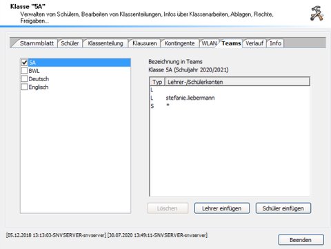 | Lehrer einfügen | Fügen Sie hier Lehrer hinzu. Diese fungieren automatisch als Teambesitzer |