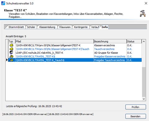 Zeigt den aktuellen Zustand der vom Schulnetzverwalter automatisch generierten Objekte. Durch Prüfen können Fehler sofort korrigiert werden.