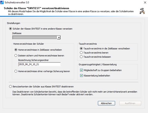 Mit diesem Modul haben Sie die Möglichkeit, alle Schüler einer Klasse entweder in eine andere Klasse zu versetzen oder alle Schüler zu deaktivieren. Weiterhin können Sie entscheiden, was mit den Daten aus dem Tauschverzeichnis der Ausgangsklasse geschehen soll. Wählen Sie zwischen