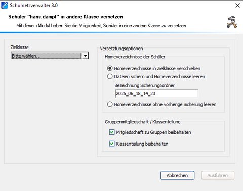 Achtung: Achten Sie darauf, dass der Schüler, den Sie versetzen möchten, nicht angemeldet ist, wenn Sie diese Operation durchführen!