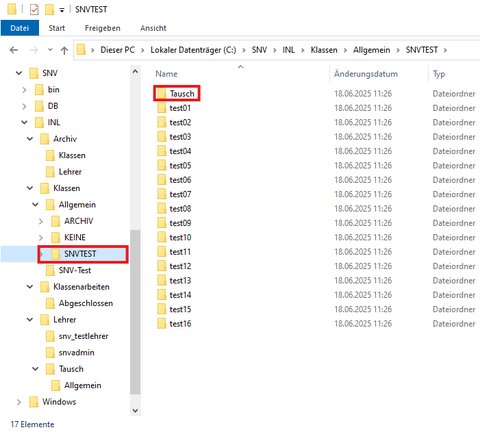 Schulnetzverwalter erstellt für jede Klasse oder Gruppe ein Verzeichnis. Unterhalb dieser Ablage wird das Tauschverzeichnis für die entsprechende Klasse oder Gruppe erstellt. Im unteren Beispiel sehen Sie die Ablagen für die Klasse “SNVTEST”.