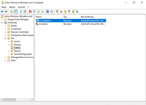 Erstellen des Benutzerobjektes in Active Directory Für jeden Lehrer wird ein Benutzerobjekt in Active Directory erstellt. Das Benutzerobjekt wird unterhalb der Organisations-Einheit Lehrer erstellt. Im unteren Beispiel sehen Sie das Active Directory Benutzerobjekt des Lehrers snv_testlehrer.