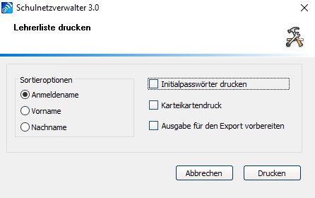 | Lehrerliste drucken | Drucken Sie eine Lehrerliste mit den Optionen: - Initialpasswörter drucken - Karteikartendruck - Ausgabe für den Export vorbereiten Siehe Lehrerliste drucken |