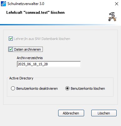 Hier haben Sie die Möglichkeit, die Daten aus dem Homeverzeichnis des Lehrers zu archivieren, bevor Sie den Lehrer löschen. Des Weiteren können Sie entscheiden, ob das Benutzerkonto in Active Directory ebenfalls gelöscht, oder nur deaktiviert werden soll.