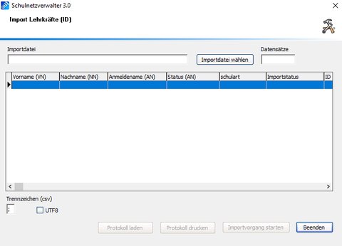 | Importstatus | Vor dem Importvorgang: aktiviert=Lehrer wird importiert leer=Datensatz wird beim Importvorgang nicht bearbeitet Nach dem Importvorgang: +AN = Lehrer wurde erzeugt |