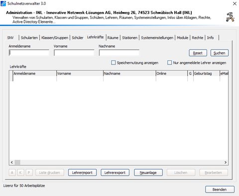 Dieser Programmteil dient zum Organisieren von Lehrern. Im Schulnetzverwalter kann eine beliebige Anzahl von Lehrern verwaltet werden. Jeder Lehrer erhält vom System ein eigenes Datei-Ablageverzeichnis, sein sogenanntes Homeverzeichnis.