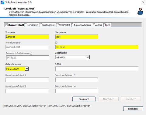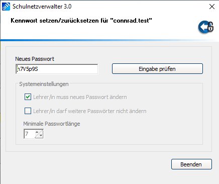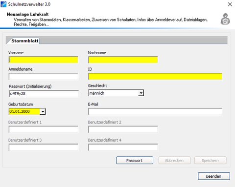| Passwort | - | Hier kann dem Lehrer ein Kennwort zugewiesen werden. In der Regel ist dieses Feld leer, das bedeutet, dass Schulnetzverwalter jeweils nach den Vorgaben in den Systemeinstellungen ein Kennwort generiert |