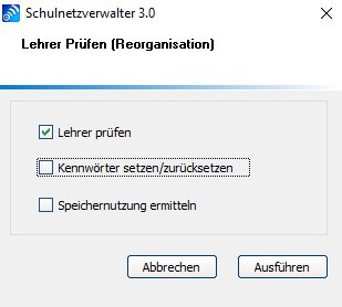 | P (=Prüfen) | Wählen Sie diese Option, wenn Sie die markierten Lehrer überprüfen oder die Kennwörter der markierten Lehrer zurücksetzen möchten. Sie können mit dieser Funktion auch die Speichernutzung der Homelaufwerke ermitteln.Siehe Prüflauf / Kennwörter zurücksetzen |