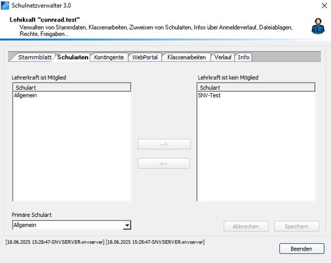 Lehrer können zu einer beliebigen Anzahl von Schularten angehören. Markieren Sie die Schulart mit der Maus und Klicken dann auf die entsprechende Schaltfläche “–>” oder “<–”.