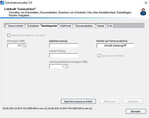 | Speichernutzung ermitteln | Klicke Sie auf diese Schaltfläche, um aktiv die aktuelle Speichernutzung des Lehrer-Homeverzeichnisses zu ermitteln |