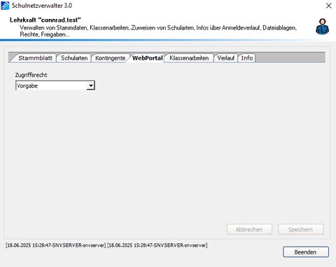 | WebPortal Zugriffsrechte | Vorgabe Wie unter Administration -> Systemeinstellungen -> Lehrer vorgegeben Freigegeben Zugriff auf das WebPortal erlaubt (überschreibt die Vorgabe) Gesperrt Zugriff auf das WebPortal gesperrt (überschreibt die Vorgabe) |