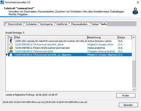 Zeigt den aktuellen Zustand der vom Schulnetzverwalter automatisch generierten Objekte. Durch das Klicken auf die Schaltfläche “Prüfen” können Fehler sofort korrigiert werden.