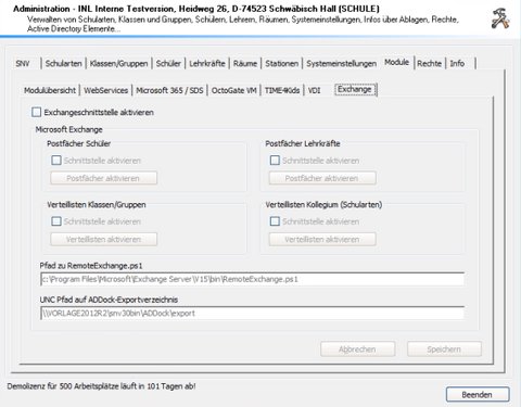 | Exchangeschnittstelle Aktivieren | Muss aktiviert sein, um die die Exchangeschnittstelle nutzen zu können |