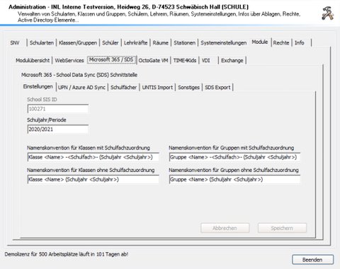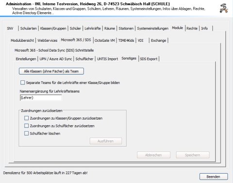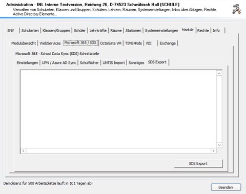 | SDS Export | Mit einem Klick auf die Schaltfläche erzeugen Sie die für SDS benötigten Dateien. Bitte beachten Sie, dass beim ersten Export das Lehrerkonto “snvmsteamsadmin” angelegt wird. Bitte bestätigen Sie diese Systemanfrage mit “Ja”. Dieser Benutzer ist automatisch als Besitzer für alle im Export definierten Teams vorgesehen |