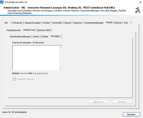 | Externer Zugriff | Erlaubt oder verhindert den Zugiff auf das webPortal von außerhalb der Schule. Für den externen Zugriff ist zusätzlich noch die Einrichtung einer Portweiterleitung auf der Firewall notwendig. Damit der snv® zwischen externem und internem Zugriff unterscheiden kann, müssen die internen IPAdressen / IP-Bereiche angegeben werden à siehe Sonstiges |