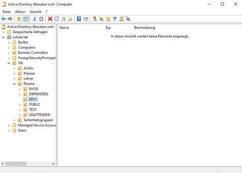 Für jeden Raum wird eine Organisationseinheit in Active Directory erstellt. Im unteren Beispiel sehen Sie die Active Directory Organisationseinheit für den Raum EDV1.