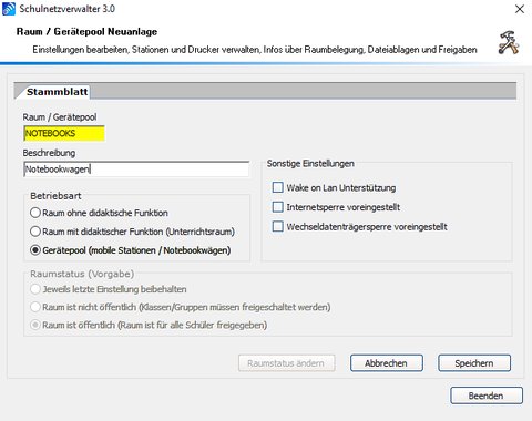 Wählt man für einen Raum als Betriebsart “Gerätepool (mobile Stationen / Notebookwägen)” dann dient dieser Raum als Gerätepool für mobile Arbeitsstationen.