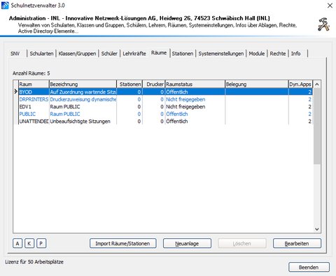 Verwenden Sie dieses Programm-Modul, um Räume sowie die zugehörigen Arbeitsstationen zu verwalten. Schulnetzverwalter unterscheidet zwischen drei Betriebsarten: