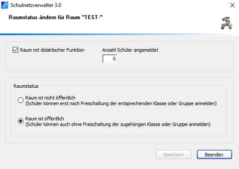 Hinweis: Der Raumstatus lässt sich nur dann ändern, wenn es sich um einen didaktischen Raum handelt und noch keine Schüler an den Arbeitsplätzen im Raum angemeldet sind. Um den aktuellen Raumstatus zu ändern, wählen Sie zwischen den Optionen “Raum ist nicht öffentlich” und “Raum ist öffentlich” und klicken Sie anschließend auf “Speichern”.