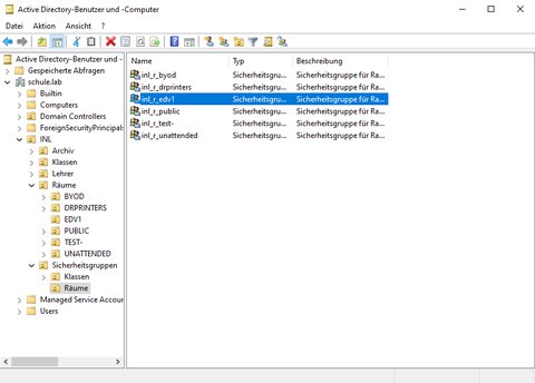 Für jeden Raum wird eine Sicherheitsgruppe in Active Directory erstellt. Im folgenden Beispiel sehen Sie die Sicherheitsgruppe inl_r_edv1, die sich aus dem Schulkürzel und dem Raum EDV1 zusammensetzt. Diese Sicherheitsgruppe findet in dieser Version vom Schulnetzverwalter keine Verwendung.