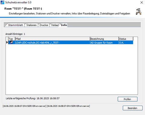 Zeigt den aktuellen Zustand der vom Schulnetzverwalter automatisch generierten Objekte. Durch das Klicken auf die Schaltfläche “Prüfen” können Fehler sofort korrigiert werden.