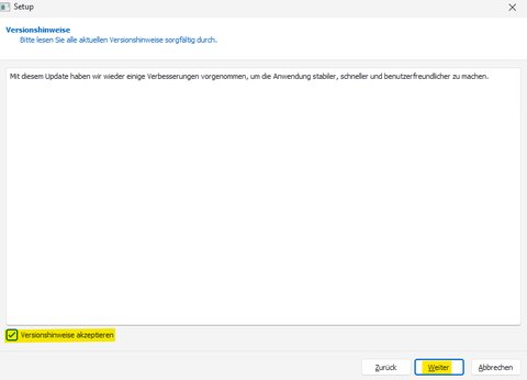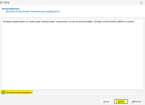 Bestätigen Sie die Versionshinweise und klicken Sie erneut auf „Weiter“.
