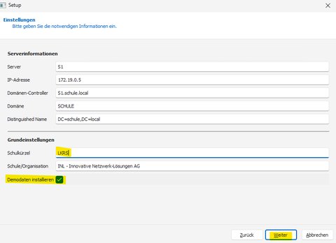 Aktivieren Sie die Option „Demodaten installieren“, um eine Testklasse mit Beispieldaten (Schüler & Lehrer) einzurichten. -