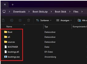 Wechseln Sie in den entpackten Ordner Boot-Stick, den Sie zuvor heruntergeladen haben. Öffnen Sie den Ordner Files und kopieren Sie dessen gesamten Inhalt (drei Dateien und drei Ordner, rot markiert) auf Ihren Boot-USB-Stick.