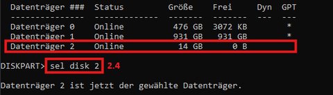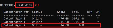 2.2. Geben Sie list disk ein und drücken Sie Enter (hier werden alle angeschlossenen Datenträger angezeigt).
