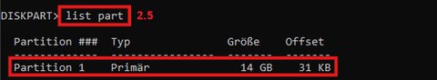 2.5. Geben Sie list part ein und drücken Sie Enter (zeigt die Partitionen des USB-Sticks an).