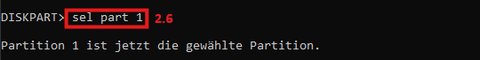 2.6. Geben Sie sel part 1 ein und drücken Sie Enter (wählt die Partition aus).