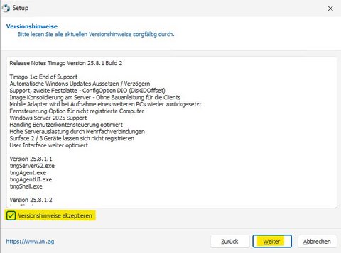 Akzeptieren Sie die Versionshinweise und klicken auf Weiter.