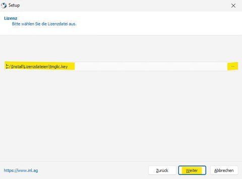 Um Ihre Lizenz zu hinterlegen, klicken Sie auf das Symbol mit den drei Punkten rechts neben dem Eingabefeld. Navigieren Sie anschließend zu Ihrer Lizenzdatei (tmglic.key) und wählen Sie diese aus.