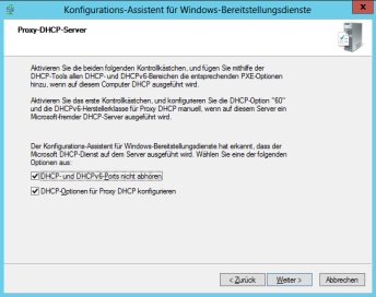 Aktivieren Sie die beiden Optionen “DHCP- und DHCPv6-Ports nicht abhören” und “DHCP-Optionen für Proxy DHCP konfigurieren” aus, wenn auf diesem Server MicrosoftDHCP ausgeführt wird und klicken Sie auf “Weiter >”.