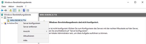 Die Bereitstellungsdienste müssen jetzt konfiguriert werden. Starten Sie hierzu die Bereitstellungsdienste über “Windowssymbol -> Bereitstellungsdienste”. Klappen Sie den Reiter “Server” auf und Klicken mit der rechten Maustaste auf ihren Server.