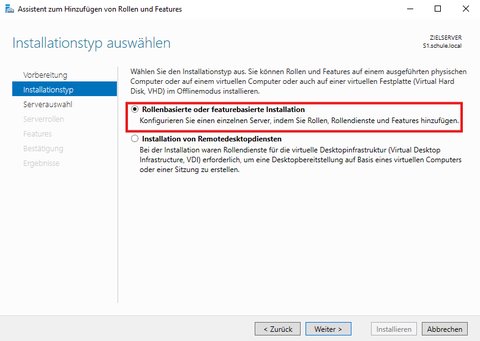 Klicken Sie auf “Weiter”. Wählen Sie als Installationstyp die “Rollenbasierte oder featurebasierte Installation” aus.