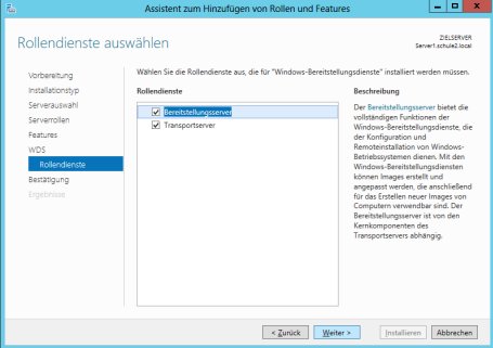 Jetzt sind die Windows-Bereitstellungsdienste ausgewählt. Klicken Sie auf “Weiter”. Wählen Sie hier den “Bereitstellungsserver” und den “Transportserver” aus und klicken Sie auf “Weiter”.