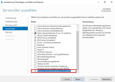 Wählen Sie die Rolle “Windows-Bereitstellungsdienste” aus und betätigen Sie die Schaltfläche “Weiter”.