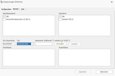 Die Anpassungen werden auf Rechnergruppen-Ebene definiert. Über die Registerkarte „Gültigkeitsbereich“ lässt sich festlegen, für welche Computer innerhalb der Gruppe die jeweilige Anpassung gelten soll – oder auch ausgeschlossen werden kann. Dabei können folgende Kriterien verwendet werden: