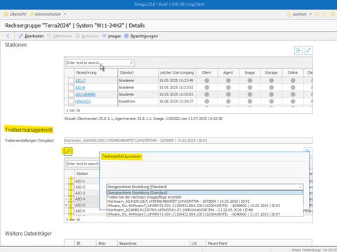 In der Übersicht sehen Sie alle Stationen der Gruppe sowie das aktuell zugewiesene Treiberpaket.