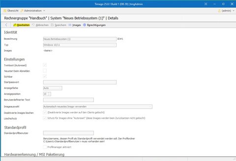 Bei einer Erstinstallation sind die Menüpunkte „Domänenbeitritt“ und „Profilbenutzer“ zunächst noch leer zu lassen. Diese Einstellungen dürfen erst vorgenommen werden, nachdem die entsprechende Konfiguration über eine Imagepflege durchgeführt wurde. Werden diese Einträge zu früh gesetzt, kann es beim Start des Systems zu Fehlermeldungen kommen oder das System lässt sich nicht korrekt starten.